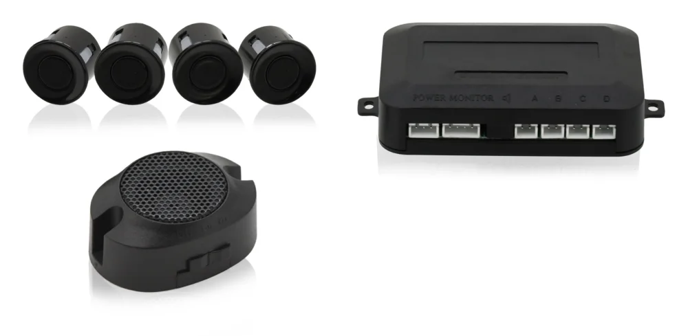 Balení obsahuje reproduktor, řídící jednotku, 4 senzory pro montáž do zadního nárazníku, odpovídající kabeláž a vrták odpovídajícího průměru.