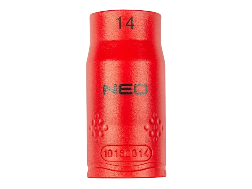 ?estihranný nástavec 1/2\\“ NEO (ref. č. 01-185) o velikosti 14 mm, zhotovený z odolné chromovo-vanadiové oceli. Certifikován pro práci pod napětím do 1000 V. ?estihranný tvar nástavce zabraňuje deformaci hlavy šroubu.