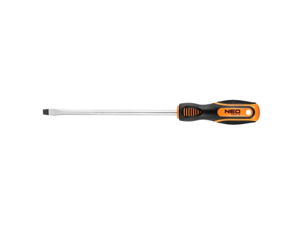 Plochý šroubovák NEO (ref. 04-176) 8 x 200 mm. ?epel je vyrobena z odolné chrom-vanadiové oceli, což zaručuje dlouhou životnost nástroje. Magnetický hrot z kalené oceli usnadňuje práci s nástrojem. Ergonomická plastová rukojeť pokrytá protiskluzovým materiálem zajišťuje bezpečnost a pohodlí při práci. Značka NEO splňuje očekávání profesionálů.
