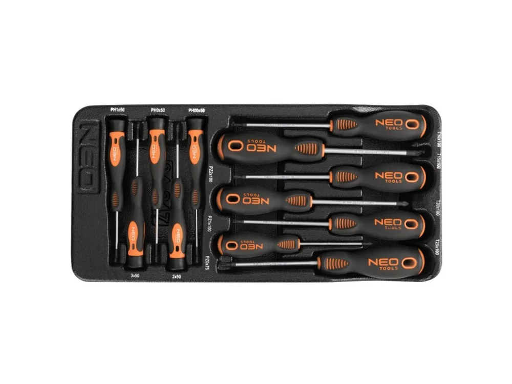 NEO šroubováky (ref. 84-247) 12 šroubováků, čepel šroubováku je vyrobena z mimořádně odolné oceli S2. Pracovní konce čepele byly tepelně zpracovány, díky čemuž bylo dosaženo přiměřené tvrdosti a odolnosti vůči ohybu. ?roubováky mají magnetické zesílené hroty. Trojúhelníkový tvar rukojeti s profilovanou opěrkou palce snižuje zatížení ruky během práce a usnadňuje dosažení optimálního točivého momentu. Rukojeť z dvojitého materiálu zabraňuje klouzání v ruce a je odolná vůči chemikáliím, olejům a tukům. Nářadí se dodává v praktickém plastovém výlisku, který se hodí do zásuvek skříní na nářadí NEO 84-221 a 84-222. Kvalitu nářadí potvrzuje certifikát T\\u00DCV a 25letá záruka výrobce. Značka NEO splňuje očekávání profesionálů.