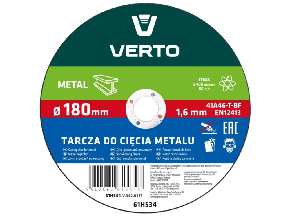 Kotouč na řezání kovů VERTO (ref. 61H534) o vnějším průměru 180 mm výrazně zkracuje čas řezání díky své menší tloušťce. Díky vysoké úrovni bezpečnosti práce díky shodě výrobku s normou EN 12413 nabízí značka VERTO sortiment elektrického nářadí a příslušenství pro každého kutila.