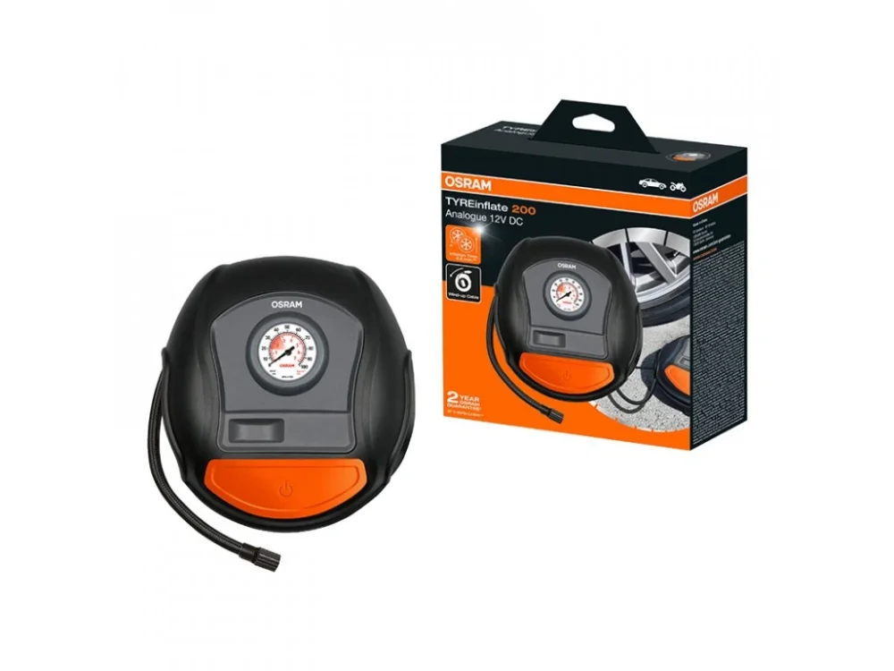 OSRAM Analogový kompresor – TYREinflate je kompaktní a snadno použitelný automobilový kompresor, díky němuž je kontrola a doplňování tlaku v pneumatikách rychlá, jednoduchá a intuitivní. Tento produkt se vyznačuje vysokou kvalitou zpracování, krátkou dobou nafouknutí pneumatiky, velkým a čitelným tlakoměrem a velkým tlačítkem zapnutí / vypnutí, které usnadňuje aktivaci zařízení i nohou.