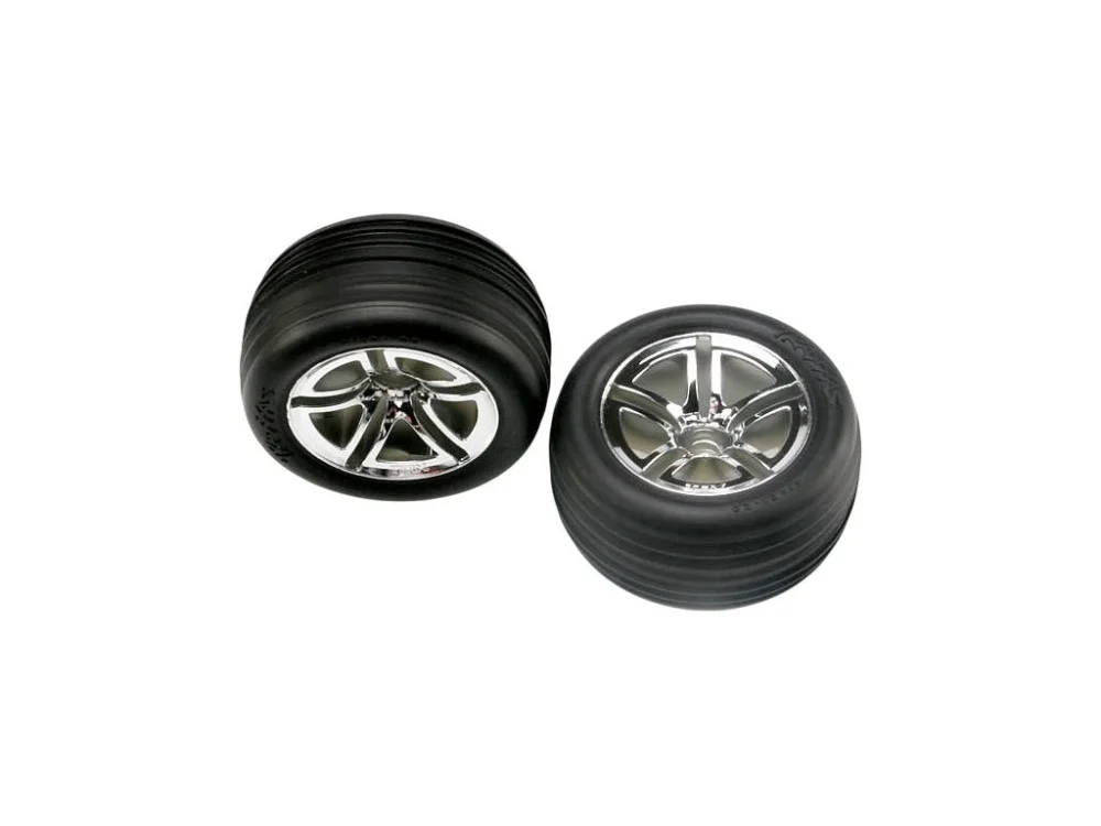Kompletní přední kola pro RC auta. Chromované disky Twin Spoke s nalepenými pneumatikami Ribbed a vložkou.
