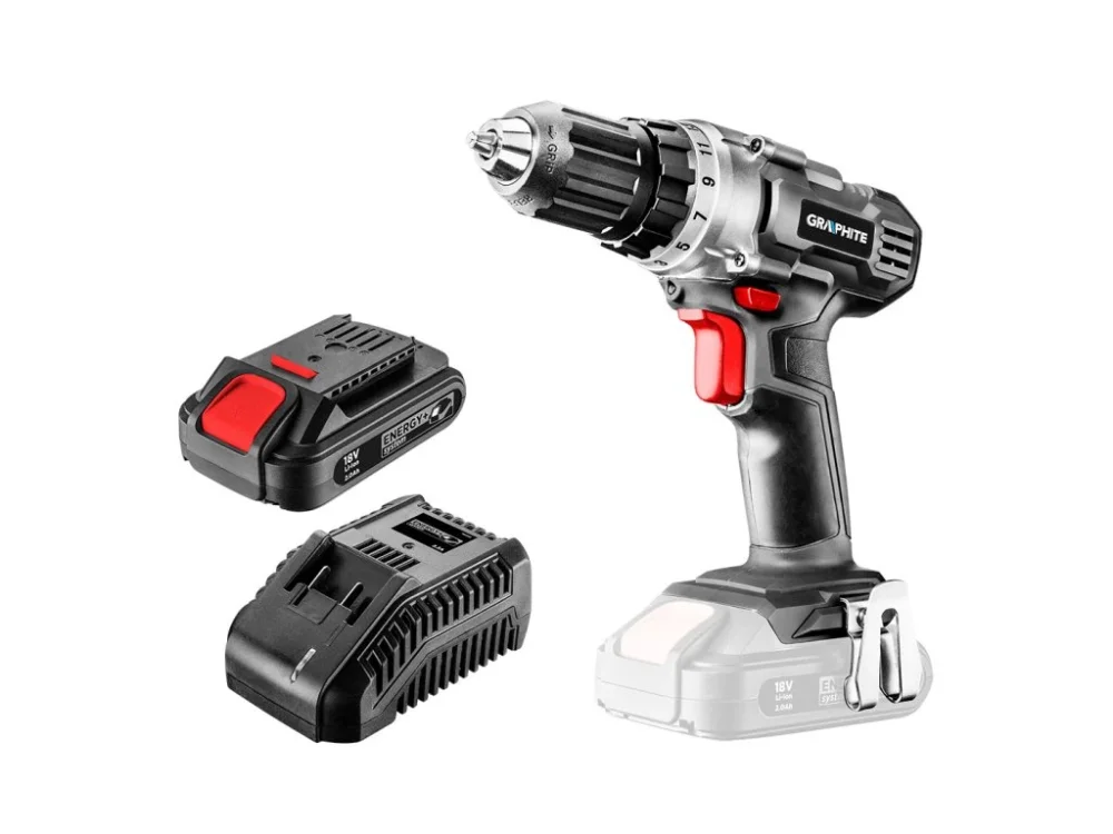 Sada GRAPHITE Energy+. Sada obsahuje: vrtačku/přístroj (58G000), akumulátor 2,0 Ah (58G001) a nabíječku 2,0 Ah (58G002). Vše v kartonové krabici. Základní sada s vrtačkou/přístrojem, akumulátorem a nabíječkou pro nepřetržitou práci. Technické údaje: vrtačka/přístroj: 18 V, Li-Ion, otáčky I: 0-350 ot/min II: 0-1250 ot/min, pravotočivá/levotočivá, sklíčidlo 0,8-10 mm, polohy spojkového kroužku 1-19 (a možnost vrtání)4 Nm, brzda vřetena, (DxV) 210 x 210 mm, hmotnost 1,1 kg.