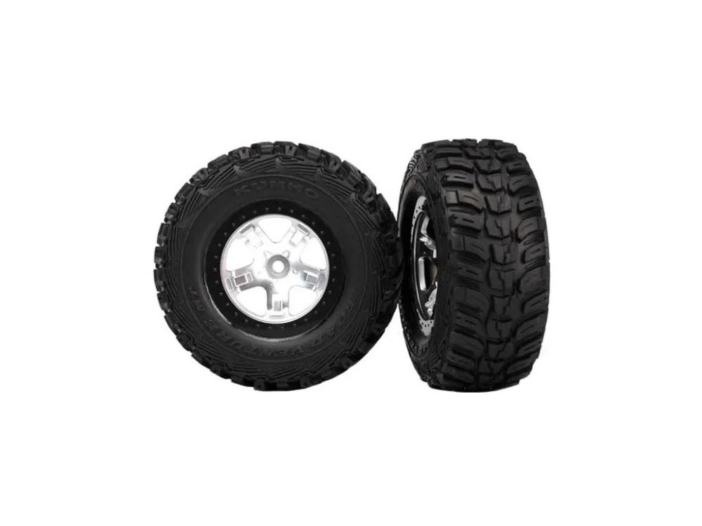 Kompletní zadní kola pro 2WD, přední i zadní pro 4WD auta Traxxas Slash. Stříbrné disky s černými ráfky Bead Lock s nalepenými pneumatikami Kumho (měkká směs) a vložkou.